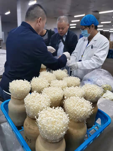 武汉市农业农村局工作人员在对供会金针菇产品进行质量安全检测抽样